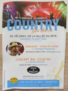 Le Vendredi 15 Aout 2025, Grande Journée Country Line Dance avec Workshops de 14h00 à 17h00, , Concert des *Texas Sidestep* et Bal Country , à Partir de 17h00, au Vélorail de la Vallée du Spin, 48 Avenue Foch, à Dieuze (57) , Moselle.