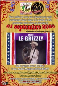 Le Dimanche 21 Septembre 2025, Après Midi Country Concert de *Bruno le Grizzly*, à 14h00, Salle Polyvalente, 03, rue André Maginot, à Flévy (57365), Moselle.
