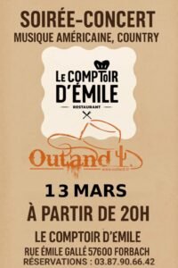 Le Vendredi 13 Mars 2026, Soirée Country avec Concert de Musique Americaine Country des *Outland*, à 20h00, au Comptoir D’Emile, rue Emile Gallé, à
