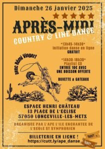 Le Dimanche 26 Janvier 2025, Apres Midi Bal Country et Line Dance , de 14h30 à 18h30, Espace Henri Chateau, 13, Place de l’église, à Longeville les Metz (57050), Moselle.