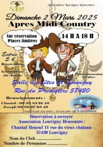 Le Dimanche 02 Mars 2025, Après Midi Bal Country, de 14h00 à 18h00, Salle des Fetes , rue du Presbytère, à Louvigny (57420), Moselle.