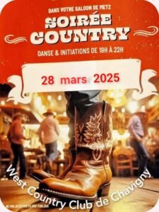 Le Vendredi 28 Mars 2025, Soirée Country chez *West Country Club de Chavigny*, avec Initiations de 19h00 à 22h00, au Saloon de Metz (57), Moselle.