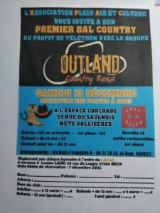 Le Samedi 13 Décembre 2025, 1er Bal Country avec Concert de *Outland Country Band*, chez *Plein Air et Culture *, à 19h15, Espace Corchade, 37 rue du Saulnois, à Metz Vallières