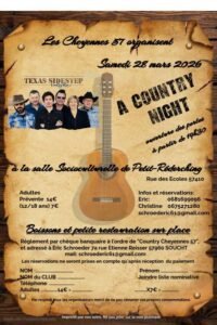 Le Samedi 28 Mars 2026, Soirée Country Night avec Concert des *Texas Sidestep*, chez *Les Cheyennes 57*, à partir de 19h30, Salle Socioculturelle, rue des Ecoles, à Pe