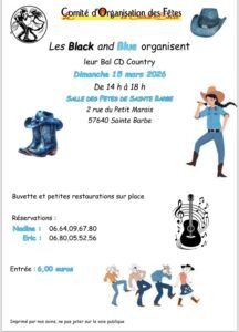 Le Dimanche 15 Mars 2026, Après Midi Bal Country cd des *Black and Blue*, de 14h00 à 18h00, Salle des Fêtes, 2 rue du Petit Ma
