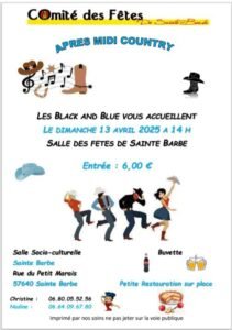 Le Dimanche 13 Avril 2025, Après Midi Bal Country des *Black And Blue *, à 14h00, Salle des Fetes , rue du Petit Marais, à Ste Barbe (57640), Moselle.