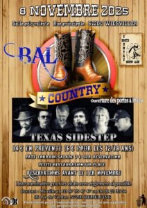 Le Samedi 08 Novembre 2025, Bal Country avec Concert des *Texas Sidestep*, à 19h30, Salle Polyvalente, rue Principale, à Wiesviller (57200), Moselle.