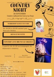 Le Samedi 28 Septembre 2024, Journée Country Night, à partir de 16h00, avec Workshop Danse Country de *Pascal Robin* et Concert de *Bruno le Grizzly*, à 21h30, Centre Cu