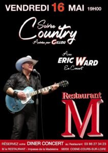 Le Vendredi 16 Mai 2025, Soirée Country animée par *Gillou*, avec un Diner Concert de *Eric Ward*, à 19h00, au Restaurant M, Impasse de la Madeleine, à Cosne Cours sur Loire (58200),