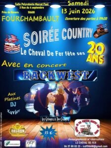 Le Samedi 13 Juin 2026, Soirée Country chez *Le Cheval de Fer Western Country Line Dance*, qui Fetera ses 20 ans, à 19h30, à Fourchambault (58600), Nièvre.