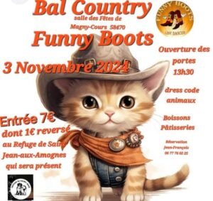 Le Dimanche 03 Novembre 2024, Après Midi Bal Country des *Funny Boots Line Dancers*, au Profit du *Refuge de St Jean aux Amognes*, à 13h30, Salle des Fetes de Magny Cou