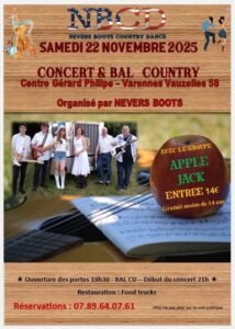 Le Samedi 22 Novembre 2025, Bal Country avec Concert des *Apple Jack*, à 21h00, chez *Nevers Boots Country Dance*, Centre Gérard Philipe, à Varennes Vauzelles (58), Nièvre.