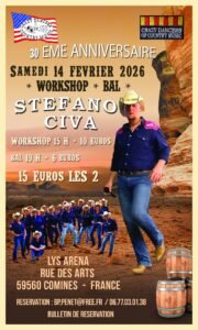 Le Samedi 14 Février 2026, Journée Country à partir de 15h00, avec Workshop de *Stefano Civa* et Bal Country à 19h00, Lys Arena, rue des Arts, à Comines (59560), Nord de la