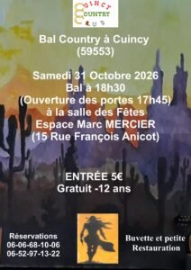 Le Samedi 31 Octobre 2026, Bal Country des *Cuincy Country Club*, à 18h30, Salle des Fêtes, Espace Marc Mercier, 15 rue François Anicot, à Cuincy (59553), Nord de la France.
