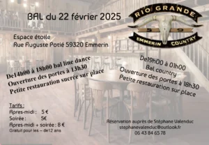 Le Samedi 22 Février 2025, Journée Country des *Rio Grande Emmerin Country*, avec Bal Line Dance de 14h00 à 18h00 et Bal Country de 19h00 à 01h00, Espace Etoile