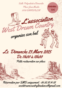 Le Dimanche 23 Mars 2025, Après Midi Bal Country chez *West Dream Country*, de 11h00 à 18h00, Salle Polyvalente, Place Jean Moulin,