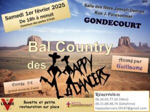 Le Samedi 1er Février 2025, Bal Country animé par *Guillaume*, de 18h00 à Minuit, Salle des FEtes Joseph Deman, rue J.Poissonnier, à Gondecourt (59), Nord de la France.