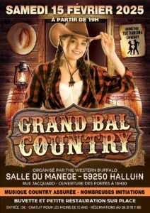 Le Samedi 15 Février 2025, Grand Bal Country chez *The Western Buffalo*, à 19h00, Salle du Manège, rue Jacquard, à Halluin (59250), Nord de la France.