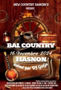 Le Samedi 16 Novembre 2024, Bal Country, animé par *DJ Gogo*, à 19h00, Salle des Fetes, 56, rue Jean Jaurès , à Hasnon (59), Nord de la France.