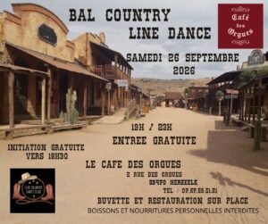 Le Samedi 26 Septembre 2026, Bal Country Line Dance de 19h00 à 23h00, au Café des Orgues, 2 rue des Orgues, à Herzeele 59470), Nord de la France.