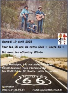 Le Samedi 19 Avril 2025, Bal Country avec Concert des *Country Wind* chez *Route 66 Jeumont*, dès 19h30, Salle Montaigne, 641, rue Maréchal L