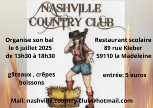Le Dimanche 06 Juillet 2025, Après Midi Bal Country chez *Nashville Country Club*, de 13h30 à 18h30, Restaurant Scolaire rue Kleber, à La Madeleine (59110), Nord de la France.
