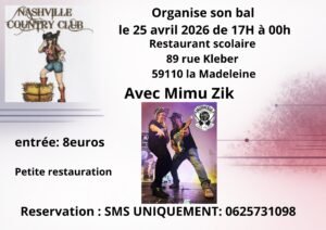 Le Samedi 25 Avril 2026, Bal Country chez *Nashville Country Club*, de 17h00 à 00h00, avec Concert de *MiMuZik*, au Restaurant Scolaire , 89 rue Kleber, à La Madeleine (59110), N