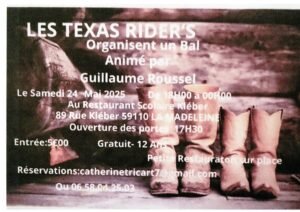 Le Samedi 24 Mai 2025, Bal Country animé par *Guillaume Roussel*, chez *Les Texas Rider’s*, de 18h00 à 00h00, Restaurant Scolaire 89 rue Kleber, à La Madeleine (59110), Nord de la