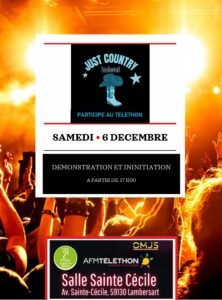 Le Samedi 06 Décembre 2025, Soirée Country chez *Just Country*, pour le Téléthon, avec Démonstration et Initiation à partir de 17h00, Salle Ste Cécile, Avenue Cécile, à
