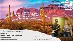 Le Samedi 15 Mars 2025, Bal Country Concert des *Happy Boots Country*, animé par *Sandy and The Prairie Dogs*, à 18h30, Salle Le Kiosk, 302, rue de Lille, à Marquette lez Lille (59520), Nord de la France.