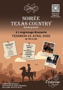 Le Vendredi 24 Avril 2026, Soirée Country des *Texas Country*, animée par *Jimmy* et *Coyote Country Club*, de 19h00 à 23h00, à *L’engrenage Brasserie*1245 Avenue du Golf , à Mérignies (59), Nord de la France.