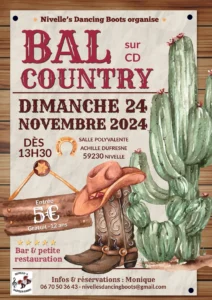 Le Dimanche 24 Novembre 2024, Après Midi Bal Country cd des *Nivelle’s Dancing Boots*, dès 13h30, Salle Polyvalente Achille Dufresne, à Nivelle (59230), Nord de la Fra