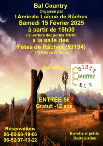 Le Samedi 15 Février 2025, Bal Country organisé par *L’amicale Laique *, avec *Quincy Country Club*, à 19h00, Salle des Fetes, 15, rue de la Gare, à Raches (59194), Nord de la France.