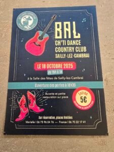 Le Samedi 18 Octobre 2025, Bal Country de 19h00 à 01h00, chez *Ch’ti Dance Country Club*, Salle des Fetes de Sailly lez Cambrai (59554), Nord de la France.