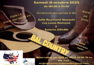 Le Samedi 18 Octobre 2025, Bal Country chez *Original Country*, de 18h30 à 00h30, Salle Raymond Nowacki, rue Louis Romond, à Salomé (59496), Nord de la France.