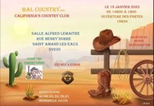 Le Samedi 18 Janvier 2025, Bal Country des *Californias Country Club*, de 19h00 à 01h00, Salle Alfred Lemaitre, rue Henry Durre, à St Amand les Eau