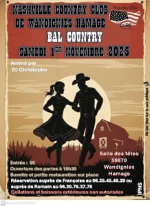 Le Samedi 1er Novembre 2025, Bal Country du *Nashville Country Club*, animé par *DJ Christophe*, à partir de 18h30, Salle des Fetes de Wandignies