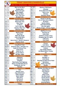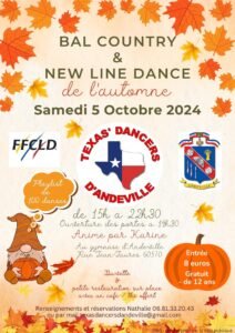 Le Samedi 05 Octobre 2024, Après Midi Country et Line Dance de L’Automne, animée par *Karine*,  chez les *Texas’ Dancers *, de 15h00 à 22h30, au Gymnase , rue Jean Jaurès, à Andev ille (60570), Oise.