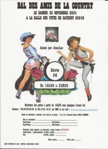 Le Samedi 30 Novembre 2024, Bal Country des *Amis de la Country*, animé par *Jean Luc*, de 16h30 à 22h30, Salle des Fetes de Catenoy (60840), Oise.