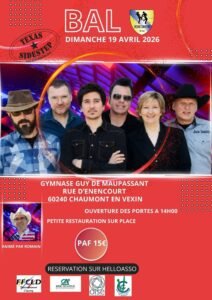 Le Dimanche 04 Avril 2026, Après Midi Bal Country animée par *Romain*, à 14h00, avec Concert des *Texas Sidestep*, au Gymnase Guy de Maupassant, rue D’Enencourt, à Chaumont en Vexin (60240), Oise.