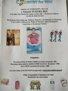 Le Samedi 29 Mars 2025, Journée Country chez *Country For You*,à partir de 09h30, avec Workshop et Bal Country cd, Salle Polyvalente, Chemin de Cla