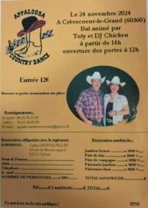 Le Dimanche 24 Novembre 2024, Après Midi Bal Country chez *Appaloosa Country Dance*, animée par *Toly et DJ Chicken*, à partir de 14h00, à Crèvecoeur le Grand (60360), Oise.