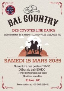 Le Samedi 15 Mars 2025, Bal Country des *Coyotes Line Dance*, à 20h00, Salle des Fetes de la Mairie de Longny les Villages (61), Orne.