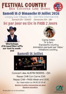 Les Samedi 18 de 10h00 à 00h00, et Dimanche 19 Juillet de 10h00 à 18h00, , Festival Country des *Coyotes Line Dance*, avec Workshops de *Arnaud Marraffa* tout le Week End, , Camp Indien, Tir à L’arc, Exposants Country, Animation Parquet par *Valou*, Initiations Country, Concert des *Austin Riders*, à Longny les Villages (61), O