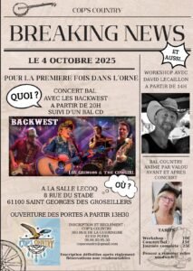 Le Samedi 04 Octobre 2025, Journée Country à partir de 14h00, avec Workshop de *David Lecaillon*, Bal Country animé par *Valou* avant et après le Concert des *Backwest*, à 20h00, Salle Lecocq, 8, rue du Stade, à St Georges de
