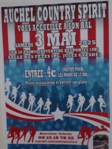 Le Samedi 03 Mai 2025, Bal Country de *Auchel Country Spirit*, de 18h30 à 00h00, Salle des Fetes, Place Jules Guesde, à Auchel (62), Pas de Calais.