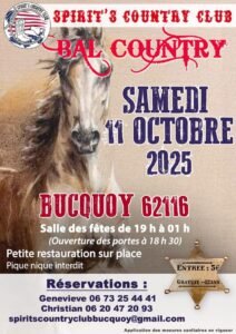 Le Samedi 11 Octobre 2025, Bal Country chez *Spirit’s Country Club*, de 19h00 à 01h00, Salle des FEtes de Bucquoy (62116), Pas de Calais.