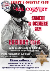 Le Samedi 12 Octobre 2024, Bal Country de 19h00 à 01h00, Salle des Fetes de Bucquoy (62116), Pas de Calais.