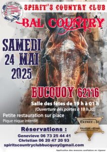 Le Samedi 24 Mai 2025, Bal Country chez *Spirit’s Country Club*, de 19h00 à 01h00, Salle des Fetes de Bucquoy (62116), Pas de Calais.