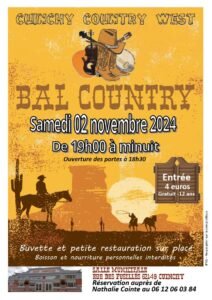 Le Samedi 02 Novembre 2024, Bal Country des *Cuinchy Country West*, de 19h00 à Minuit, Salle Municipale, rue des Fusillés, à Cuinchy (62149), Pas de Calais.